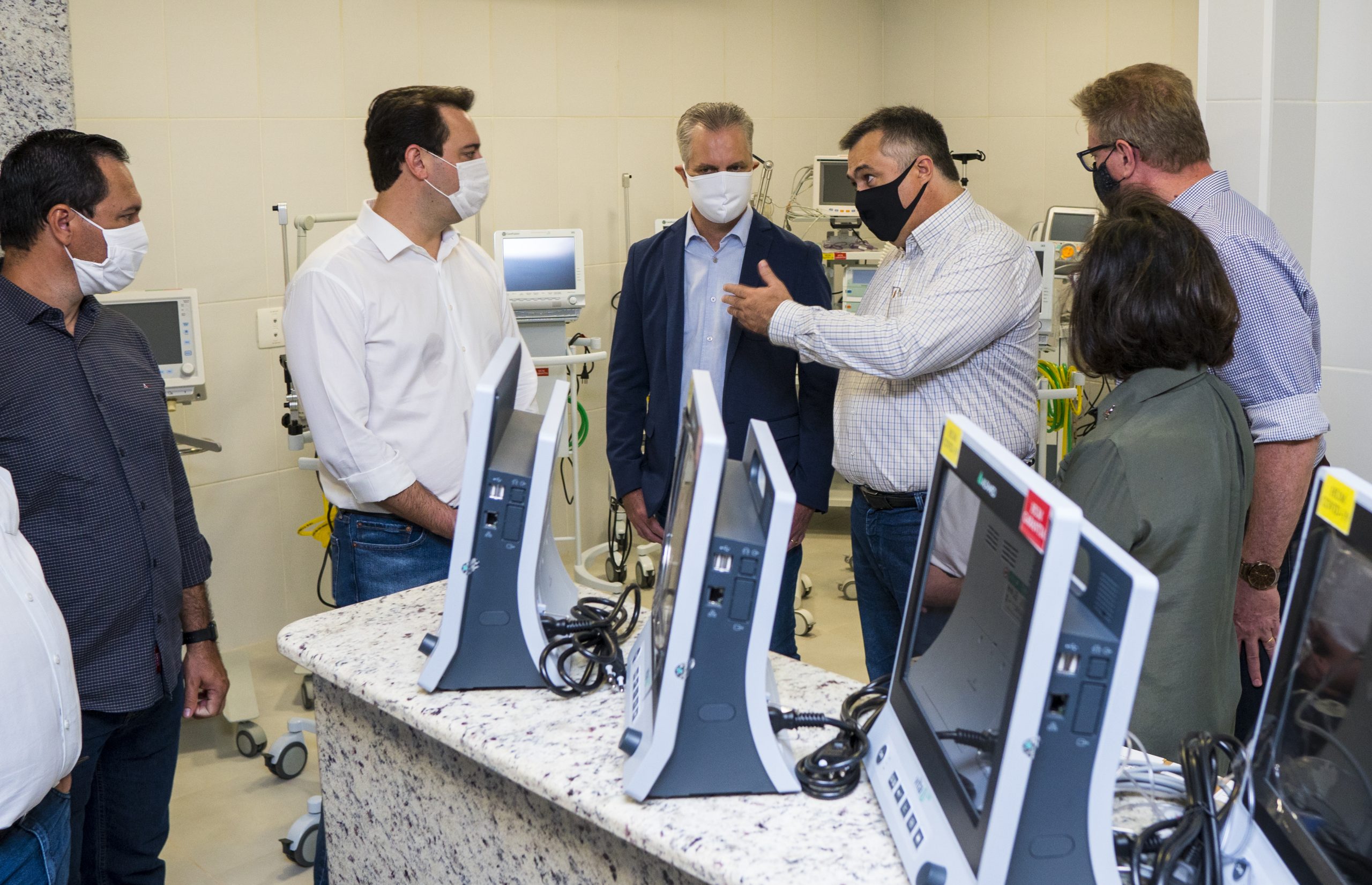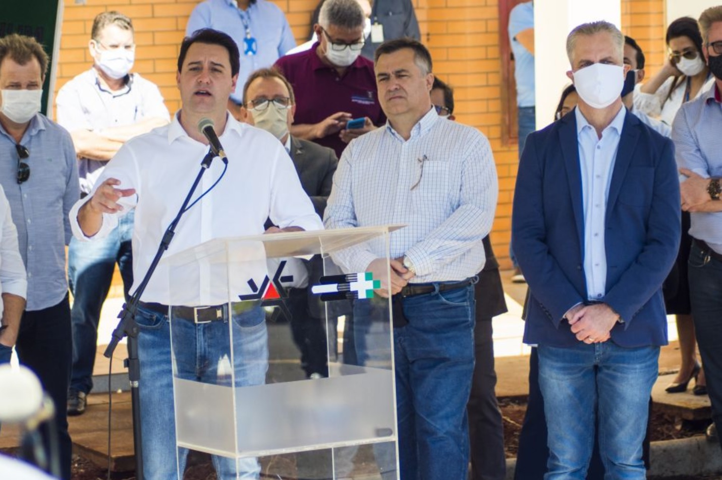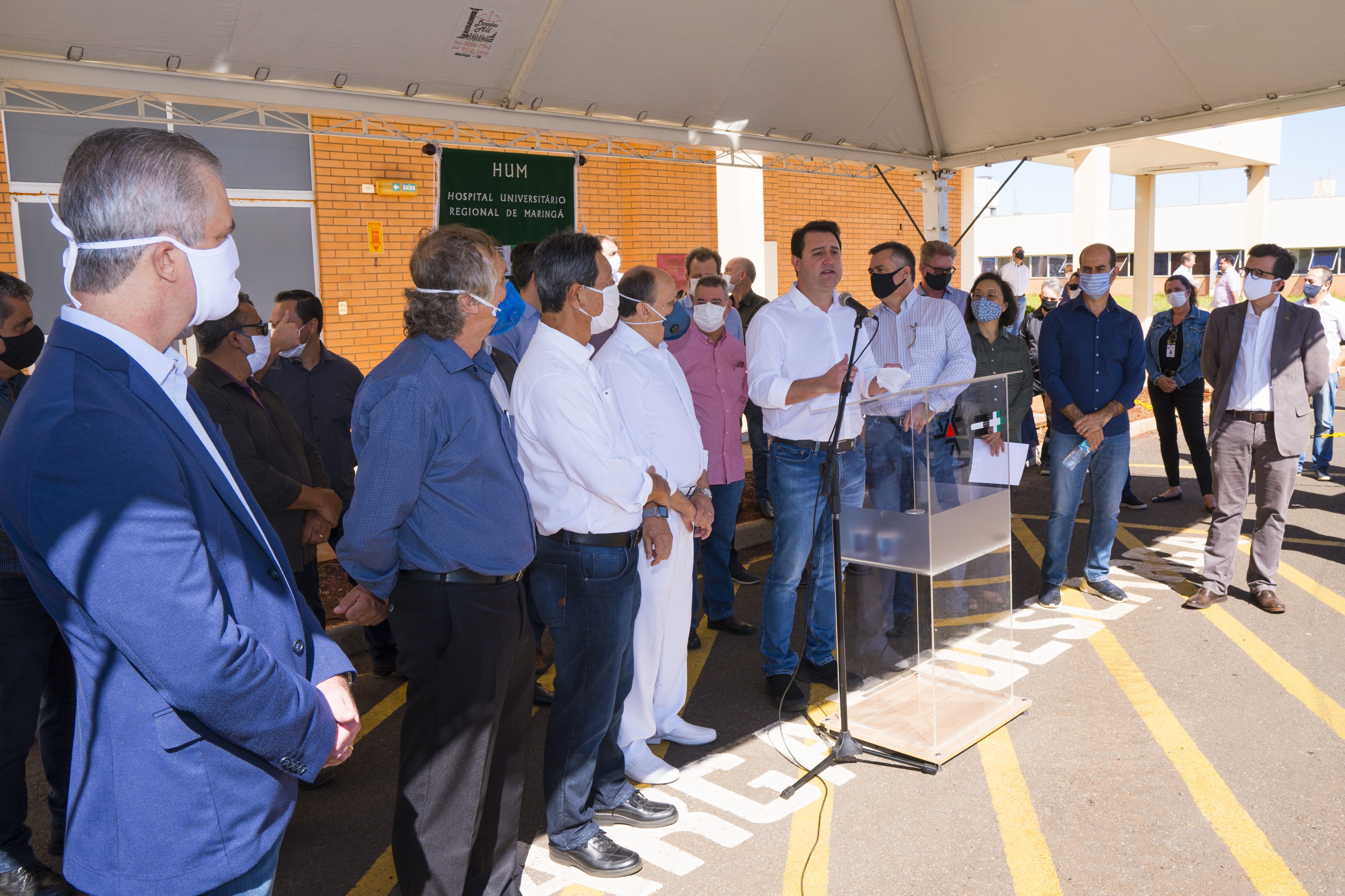 Ratinho Junior esteve em Maringá para assinar Termo de Autorização de Repasse de R$ 15,3 milhões para o Hospital Universitário de Maringá (HUM). Verba faz parte de medidas estaduais em prevenção ao coronavírus visando 500 novos leitos estaduais de UTI.