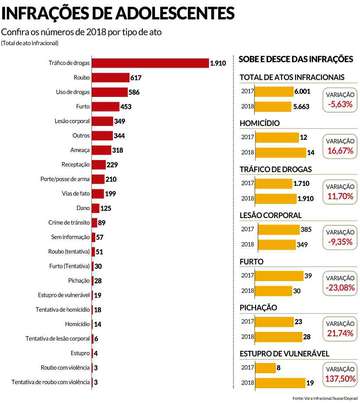 Os atos relacionados ao tráfico ficaram no topo do ranking das infrações, passando de 1.710, em 2017, para 1.910 em 2018, um aumento de 11,70%.  “Atribuo o tráfico de drogas à falta de oportunidade, principalmente de trabalho para essa geração atual de adolescentes”, afirma a desembargadora Valéria Rodrigues Queiroz, superintendente da coordenadoria da infância e da juventude. Ela defendeu que a legislação permita que eles trabalhem mais cedo. “Pelas leis trabalhistas, os adolescentes só podem trabalhar a partir dos 16 anos. A meu ver é uma idade que tem que ser revista. O adolescente tem que ajudar em casa”, completou. Para ela, o tráfico de drogas tem sido “a única firma” a oferecer oportunidade para esses jovens.
